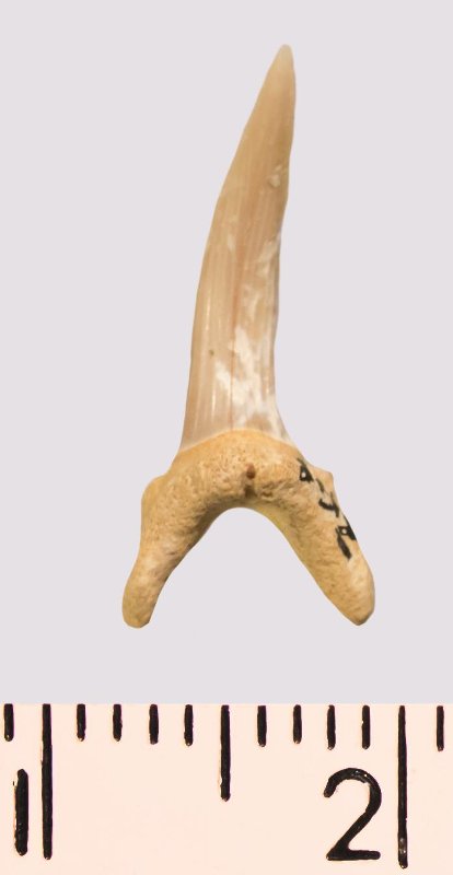 Зуб. Акула. Scapanorhynchus rhaphiodon Agassiz, 1843. Классификация: Хордовые Chordata, Позвоночные Vertebrata, Хрящевые рыбы Chondrichthyes, Пластиножаберные Elasmobranchii