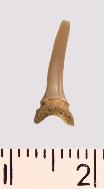Зуб. Акула. Scapanorhynchus rhaphiodon Agassiz, 1843. Классификация: Хордовые Chordata, Позвоночные Vertebrata, Хрящевые рыбы Chondrichthyes, Пластиножаберные Elasmobranchii