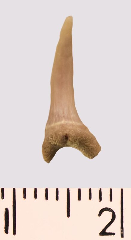 Зуб. Акула. Scapanorhynchus rhaphiodon Agassiz, 1843. Классификация: Хордовые Chordata, Позвоночные Vertebrata, Хрящевые рыбы Chondrichthyes, Пластиножаберные Elasmobranchii