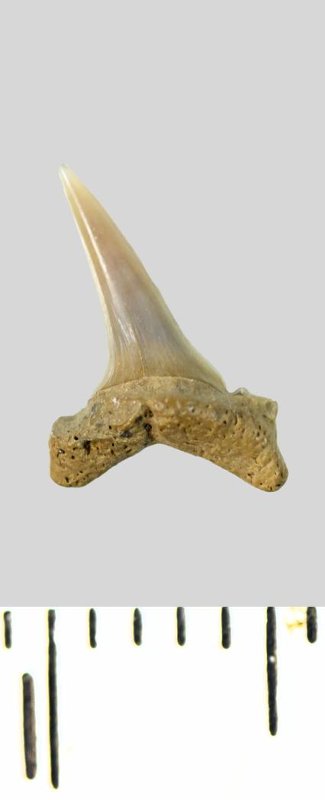 Зуб. Акула. Odontaspis subulata (Agassiz, 1843). Классификация: Хордовые Chordata, Позвоночные Vertebrata, Хрящевые рыбы Chondrichthyes, Пластиножаберные Elasmobranchii, Акулы Selachii, Ламнообразные Lamniformes