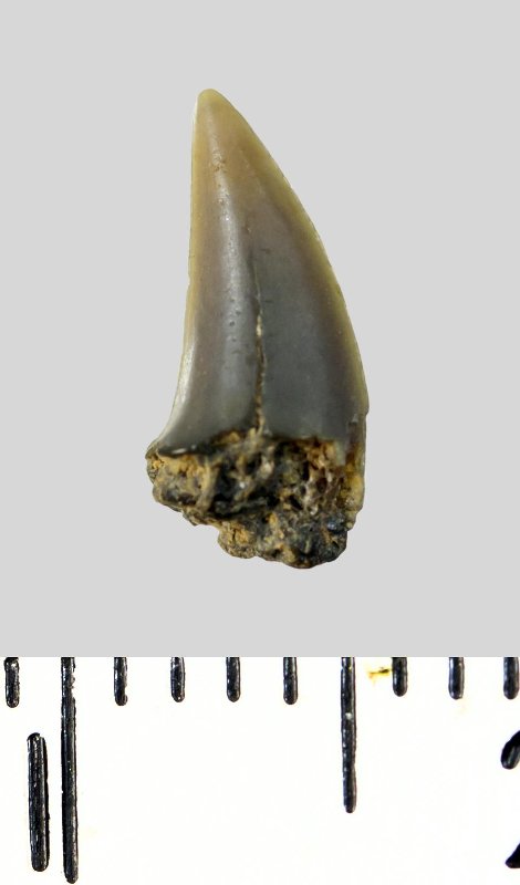 Зуб (фрагмент). Акула. Odontaspis macrorhiza (Cope) Leriche, 1902. Классификация: Хордовые Chordata, Позвоночные Vertebrata, Хрящевые рыбы Chondrichthyes, Пластиножаберные Elasmobranchii, Акулы Selachii, Ламнообразные Lamniformes