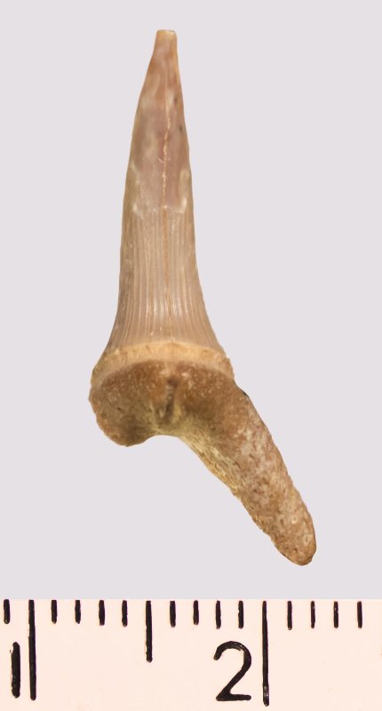 Зуб. Акула. Scapanorhynchus rapax Quaas, 1902. Классификация: Хордовые Chordata, Позвоночные Vertebrata, Хрящевые рыбы Chondrichthyes, Пластиножаберные Elasmobranchii