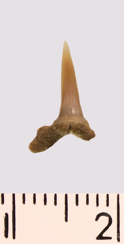Зуб. Акула. Scapanorhynchus rhaphiodon Agassiz, 1843. Классификация: Хордовые Chordata, Позвоночные Vertebrata, Хрящевые рыбы Chondrichthyes, Пластиножаберные Elasmobranchii