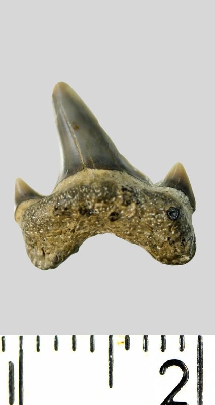 Зуб. Акула. Odontaspis macrorhiza (Cope) Leriche, 1902. Классификация: Хордовые Chordata, Позвоночные Vertebrata, Хрящевые рыбы Chondrichthyes, Пластиножаберные Elasmobranchii, Акулы Selachii, Ламнообразные Lamniformes