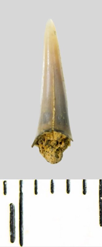 Зуб (фрагмент). Акула. Odontaspis subulata (Agassiz, 1843). Классификация: Хордовые Chordata, Позвоночные Vertebrata, Хрящевые рыбы Chondrichthyes, Пластиножаберные Elasmobranchii, Акулы Selachii, Ламнообразные Lamniformes