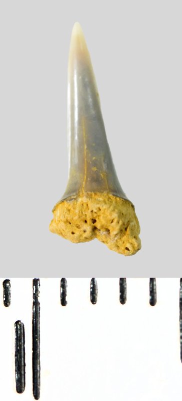 Зуб (фрагмент). Акула. Odontaspis subulata (Agassiz, 1843). Классификация: Хордовые Chordata, Позвоночные Vertebrata, Хрящевые рыбы Chondrichthyes, Пластиножаберные Elasmobranchii, Акулы Selachii, Ламнообразные Lamniformes