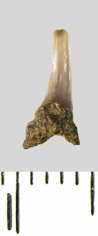 Зуб. Акула. Odontaspis subulata (Agassiz, 1843). Классификация: Хордовые Chordata, Позвоночные Vertebrata, Хрящевые рыбы Chondrichthyes, Пластиножаберные Elasmobranchii, Акулы Selachii, Ламнообразные Lamniformes
