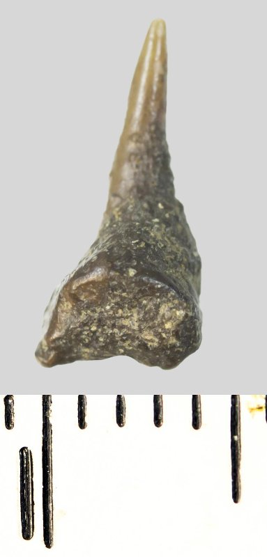 Зуб. Акула. Odontaspis subulata (Agassiz, 1843). Классификация: Хордовые Chordata, Позвоночные Vertebrata, Хрящевые рыбы Chondrichthyes, Пластиножаберные Elasmobranchii, Акулы Selachii, Ламнообразные Lamniformes