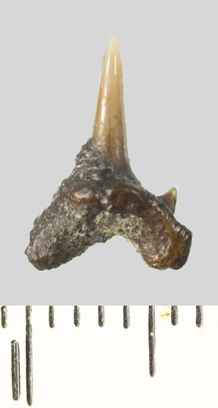 Зуб. Акула. Odontaspis subulata (Agassiz, 1843). Классификация: Хордовые Chordata, Позвоночные Vertebrata, Хрящевые рыбы Chondrichthyes, Пластиножаберные Elasmobranchii, Акулы Selachii, Ламнообразные Lamniformes