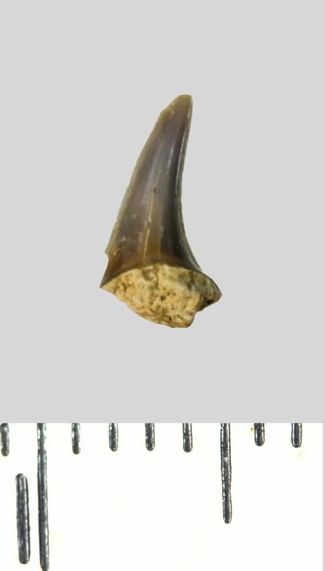 Зуб (фрагмент). Акула. Odontaspis macrorhiza (Cope) Leriche, 1902. Классификация: Хордовые Chordata, Позвоночные Vertebrata, Хрящевые рыбы Chondrichthyes, Пластиножаберные Elasmobranchii, Акулы Selachii, Ламнообразные Lamniformes