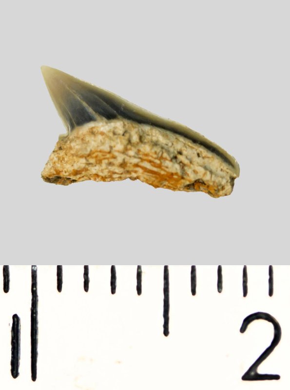 Зуб (фрагмент). Акула. Palaeoanacorax volgensis Glueckman, 1971. Классификация: Хордовые Chordata, Позвоночные Vertebrata, Хрящевые рыбы Chondrichthyes, Пластиножаберные Elasmobranchii, Акулы Selachii, Ламнообразные Lamniformes