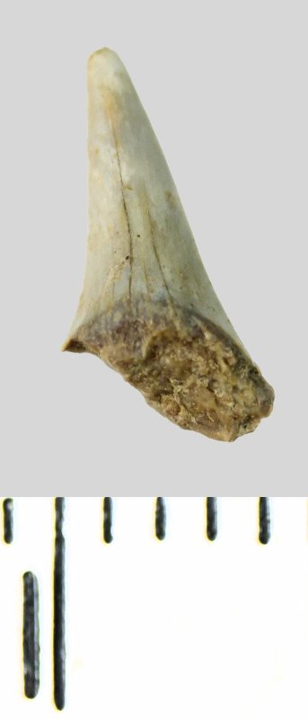 Зуб (фрагмент). Акула. Lamniformes gen. et sp. indet. Классификация: Хордовые Chordata, Позвоночные Vertebrata, Хрящевые рыбы Chondrichthyes, Пластиножаберные Elasmobranchii, Акулы Selachii, Ламнообразные Lamniformes