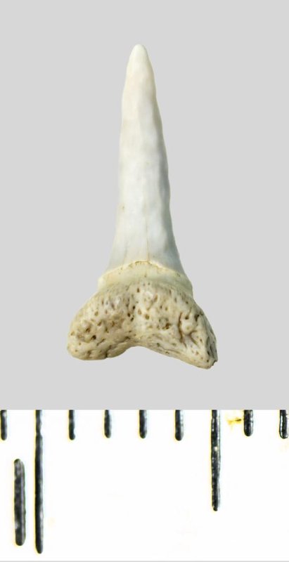 Зуб. Акула. Odontaspis subulata (Agassiz, 1843). Классификация: Хордовые Chordata, Позвоночные Vertebrata, Хрящевые рыбы Chondrichthyes, Пластиножаберные Elasmobranchii, Акулы Selachii, Ламнообразные Lamniformes