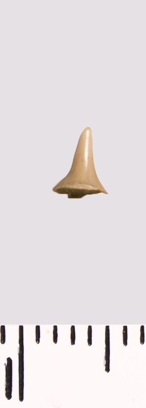 Зуб (фрагмент). Акула. Lamniformes gen. et sp. indet. Классификация: Хордовые Chordata, Позвоночные Vertebrata, Хрящевые рыбы Chondrichthyes, Пластиножаберные Elasmobranchii