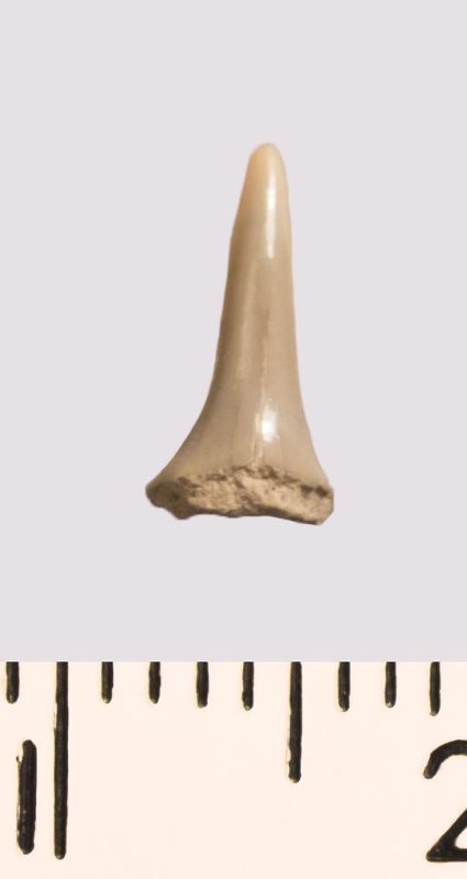 Зуб (фрагмент). Акула. Odontaspis venusta (Leriche, 1929). Классификация: Хордовые Chordata, Позвоночные Vertebrata, Хрящевые рыбы Chondrichthyes, Пластиножаберные Elasmobranchii
