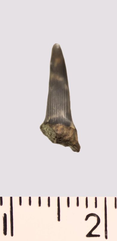 Зуб (фрагмент). Акула. Scapanorhynchus rhaphiodon Agassiz, 1843. Классификация: Хордовые Chordata, Позвоночные Vertebrata, Хрящевые рыбы Chondrichthyes, Пластиножаберные Elasmobranchii