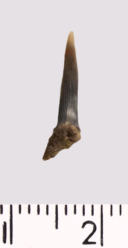 Зуб. Акула. Scapanorhynchus rhaphiodon Agassiz, 1843. Классификация: Хордовые Chordata, Позвоночные Vertebrata, Хрящевые рыбы Chondrichthyes, Пластиножаберные Elasmobranchii