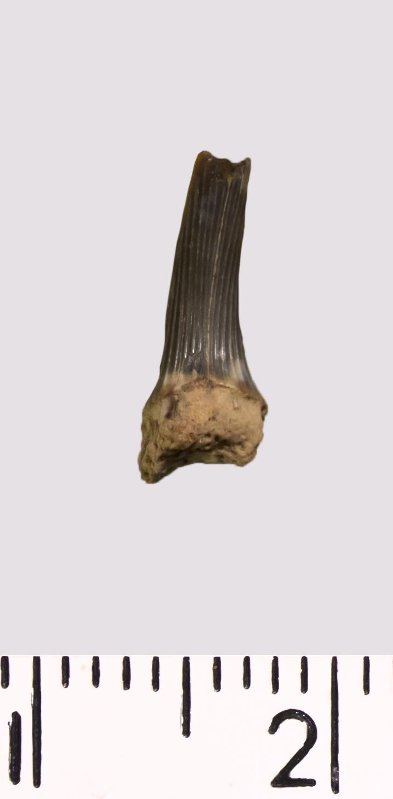 Зуб. Акула. Scapanorhynchus rhaphiodon Agassiz, 1843. Классификация: Хордовые Chordata, Позвоночные Vertebrata, Хрящевые рыбы Chondrichthyes, Пластиножаберные Elasmobranchii