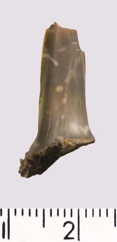 Зуб (фрагмент). Акула. Scapanorhynchus gigas Woodward, 1889. Классификация: Хордовые Chordata, Позвоночные Vertebrata, Хрящевые рыбы Chondrichthyes, Пластиножаберные Elasmobranchii