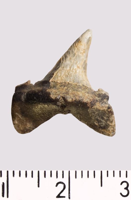 Зуб. Акула. Lamniformes gen. et sp. indet. Классификация: Хордовые Chordata, Позвоночные Vertebrata, Хрящевые рыбы Chondrichthyes, Пластиножаберные Elasmobranchii