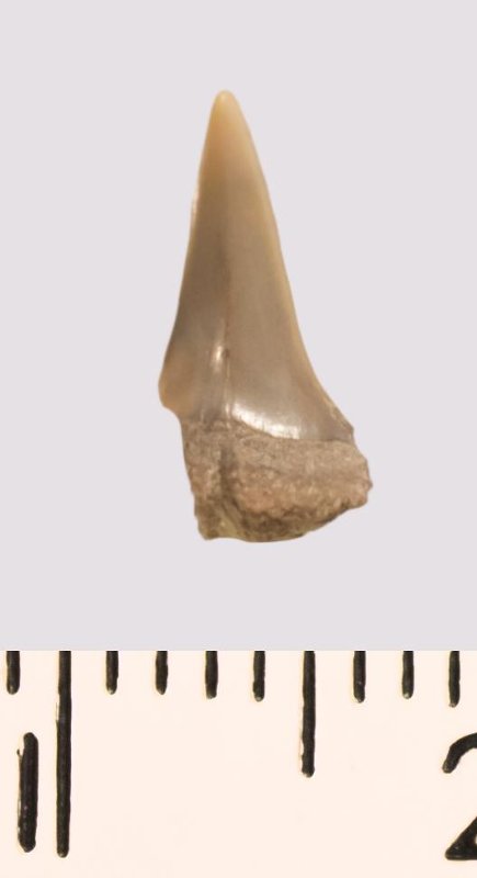 Зуб (фрагмент). Акула. Odontaspis venusta (Leriche, 1929). Классификация: Хордовые Chordata, Позвоночные Vertebrata, Хрящевые рыбы Chondrichthyes, Пластиножаберные Elasmobranchii