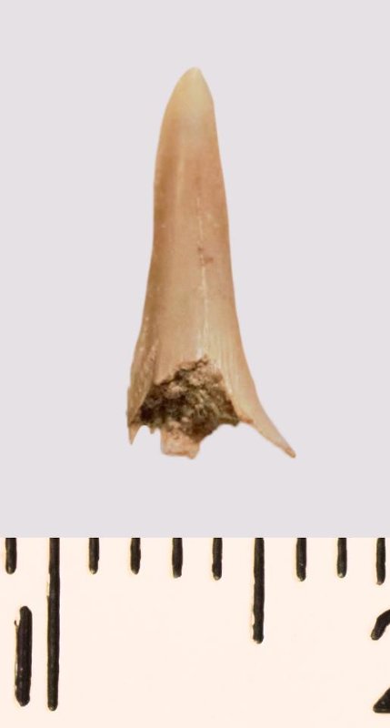 Зуб (фрагмент). Акула. Odontaspis venusta (Leriche, 1929). Классификация: Хордовые Chordata, Позвоночные Vertebrata, Хрящевые рыбы Chondrichthyes, Пластиножаберные Elasmobranchii