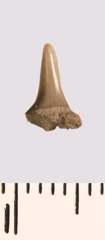 Зуб (фрагмент). Акула. Odontaspis venusta (Leriche, 1929). Классификация: Хордовые Chordata, Позвоночные Vertebrata, Хрящевые рыбы Chondrichthyes, Пластиножаберные Elasmobranchii