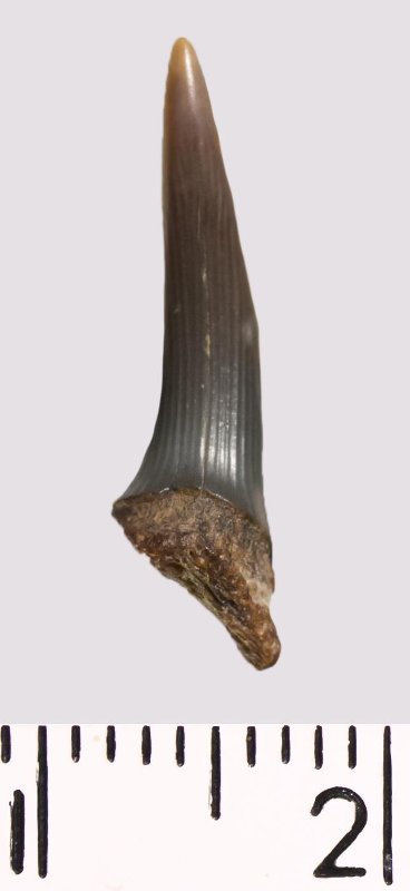 Зуб. Акула. Scapanorhynchus rhaphiodon Agassiz, 1843. Классификация: Хордовые Chordata, Позвоночные Vertebrata, Хрящевые рыбы Chondrichthyes, Пластиножаберные Elasmobranchii