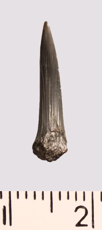 Зуб (фрагмент). Акула. Scapanorhynchus rhaphiodon Agassiz, 1843. Классификация: Хордовые Chordata, Позвоночные Vertebrata, Хрящевые рыбы Chondrichthyes, Пластиножаберные Elasmobranchii