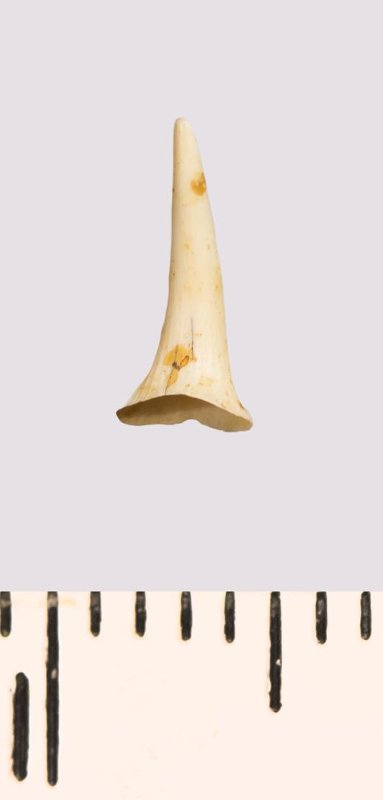 Зуб (фрагмент). Акула. Scapanorhynchus gracilis (Davis, 1890). Классификация: Хордовые Chordata, Позвоночные Vertebrata, Хрящевые рыбы Chondrichthyes, Пластиножаберные Elasmobranchii
