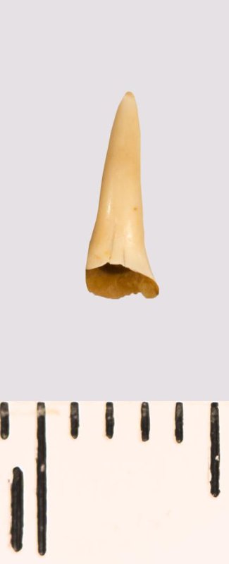 Зуб (фрагмент). Акула. Scapanorhynchus gracilis (Davis, 1890). Классификация: Хордовые Chordata, Позвоночные Vertebrata, Хрящевые рыбы Chondrichthyes, Пластиножаберные Elasmobranchii