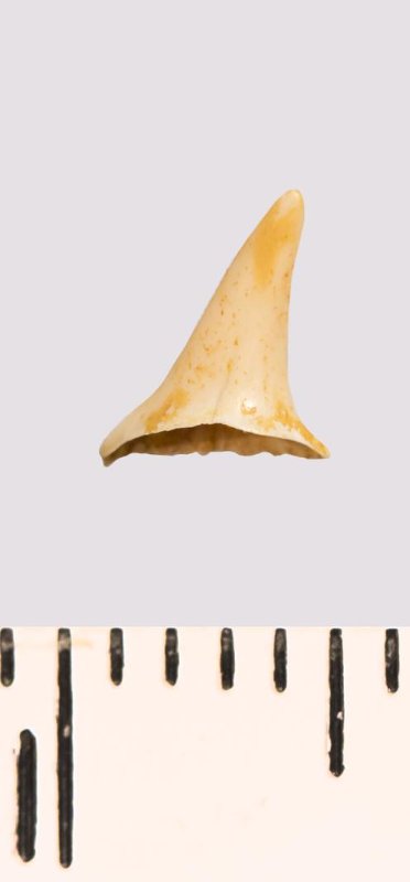Зуб (фрагмент). Акула. Scapanorhynchus gracilis (Davis, 1890). Классификация: Хордовые Chordata, Позвоночные Vertebrata, Хрящевые рыбы Chondrichthyes, Пластиножаберные Elasmobranchii