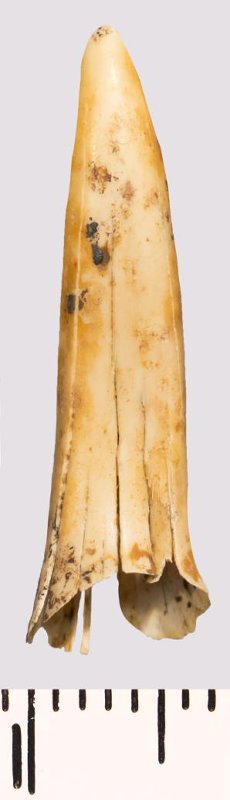 Зуб (фрагмент). Акула. Scapanorhynchus gigas Woodward, 1889. Классификация: Хордовые Chordata, Позвоночные Vertebrata, Хрящевые рыбы Chondrichthyes, Пластиножаберные Elasmobranchii