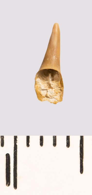 Зуб (фрагмент). Акула. Synechodus sp. Классификация: Хордовые Chordata, Позвоночные Vertebrata, Хрящевые рыбы Chondrichthyes, Пластиножаберные Elasmobranchii