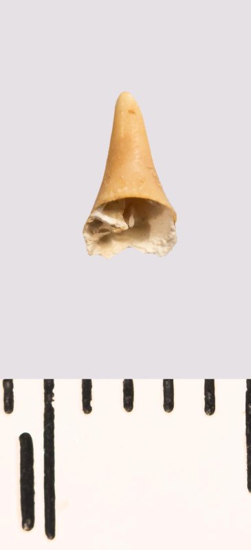 Зуб (фрагмент). Акула. Synechodus sp. Классификация: Хордовые Chordata, Позвоночные Vertebrata, Хрящевые рыбы Chondrichthyes, Пластиножаберные Elasmobranchii