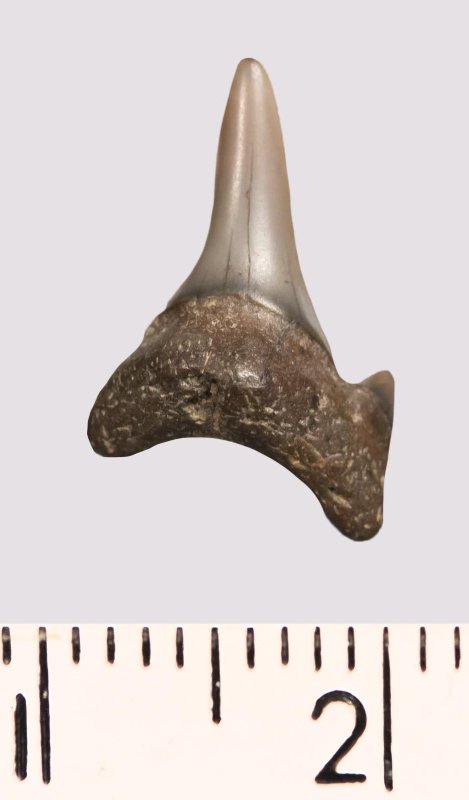 Зуб. Акула. Odontaspis macrorhiza (Cope) Leriche, 1902. Классификация: Хордовые Chordata, Позвоночные Vertebrata, Хрящевые рыбы Chondrichthyes, Пластиножаберные Elasmobranchii