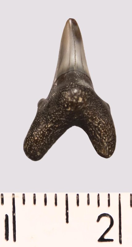 Зуб. Акула. Odontaspis macrorhiza (Cope) Leriche, 1902. Классификация: Хордовые Chordata, Позвоночные Vertebrata, Хрящевые рыбы Chondrichthyes, Пластиножаберные Elasmobranchii