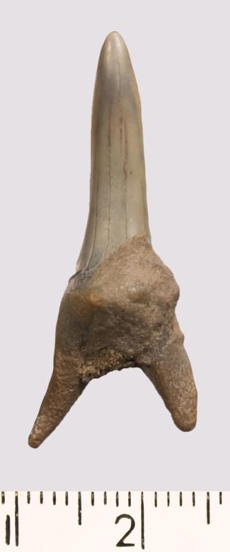 Зуб. Акула. Scapanorhynchus gigas Woodward, 1889. Классификация: Хордовые Chordata, Позвоночные Vertebrata, Хрящевые рыбы Chondrichthyes, Пластиножаберные Elasmobranchii