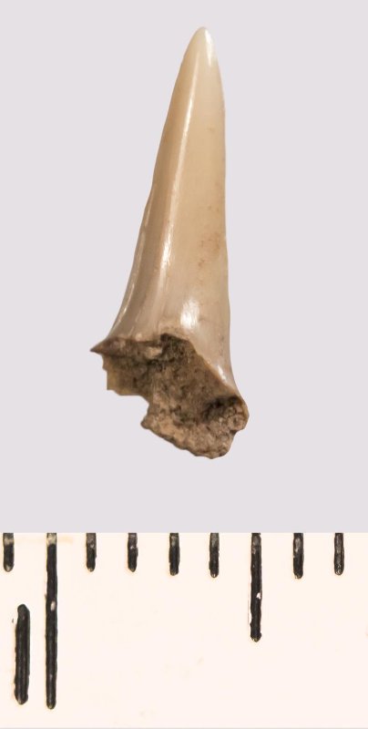 Зуб (фрагмент). Акула. Odontaspis subulata (Agassiz, 1843). Классификация: Хордовые Chordata, Позвоночные Vertebrata, Хрящевые рыбы Chondrichthyes, Пластиножаберные Elasmobranchii