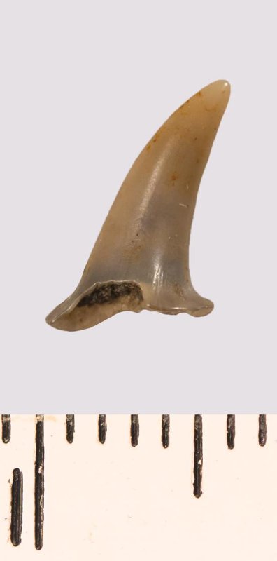 Зуб (фрагмент). Акула. Odontaspis striatula Dalinkevicius, 1935. Классификация: Хордовые Chordata, Позвоночные Vertebrata, Хрящевые рыбы Chondrichthyes, Пластиножаберные Elasmobranchii