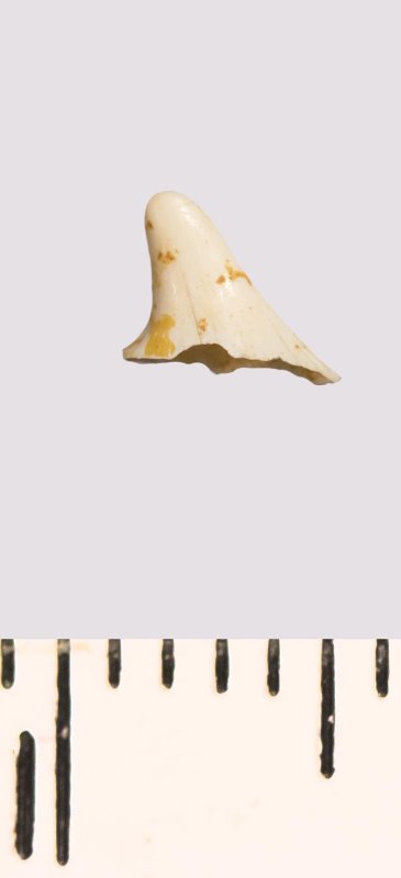 Зуб (фрагмент). Акула. Scapanorhynchus gracilis (Davis, 1890). Классификация: Хордовые Chordata, Позвоночные Vertebrata, Хрящевые рыбы Chondrichthyes, Пластиножаберные Elasmobranchii