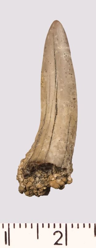 Зуб (фрагмент). Акула. Scapanorhynchus gigas Woodward, 1889. Классификация: Хордовые Chordata, Позвоночные Vertebrata, Хрящевые рыбы Chondrichthyes, Пластиножаберные Elasmobranchii