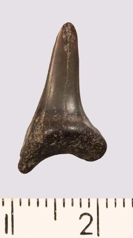Зуб. Акула. Scapanorhynchus gigas Woodward, 1889. Классификация: Хордовые Chordata, Позвоночные Vertebrata, Хрящевые рыбы Chondrichthyes, Пластиножаберные Elasmobranchii