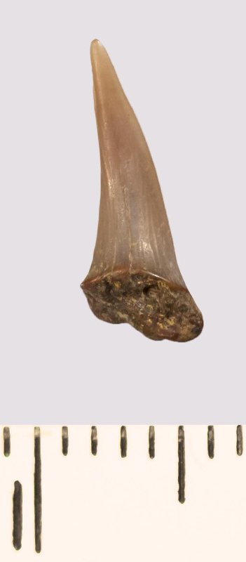 Зуб (фрагмент). Акула. Eostriatolamia sp. Классификация: Хордовые Chordata, Позвоночные Vertebrata, Хрящевые рыбы Chondrichthyes, Пластиножаберные Elasmobranchii