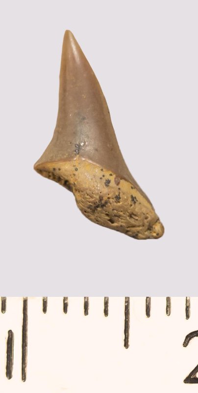 Зуб (фрагмент). Акула. Eostriatolamia sp. Классификация: Хордовые Chordata, Позвоночные Vertebrata, Хрящевые рыбы Chondrichthyes, Пластиножаберные Elasmobranchii