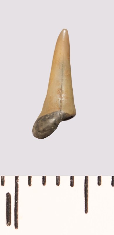 Зуб (фрагмент). Акула. Lamniformes gen. et sp. indet. Классификация: Хордовые Chordata, Позвоночные Vertebrata, Хрящевые рыбы Chondrichthyes, Пластиножаберные Elasmobranchii