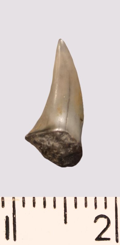 Зуб (фрагмент). Акула. Odontaspis macrorhiza (Cope) Leriche, 1902. Классификация: Хордовые Chordata, Позвоночные Vertebrata, Хрящевые рыбы Chondrichthyes, Пластиножаберные Elasmobranchii