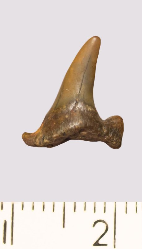 Зуб (фрагмент). Акула. Odontaspis macrorhiza (Cope) Leriche, 1902. Классификация: Хордовые Chordata, Позвоночные Vertebrata, Хрящевые рыбы Chondrichthyes, Пластиножаберные Elasmobranchii