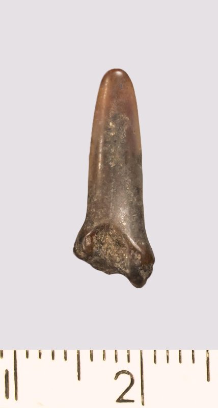 Зуб (фрагмент). Акула. Scapanorhynchus gigas Woodward, 1889. Классификация: Хордовые Chordata, Позвоночные Vertebrata, Хрящевые рыбы Chondrichthyes, Пластиножаберные Elasmobranchii