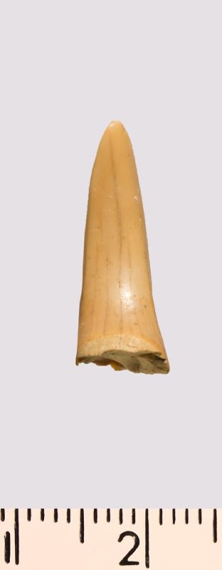 Зуб (фрагмент). Акула. Scapanorhynchus gigas Woodward, 1889. Классификация: Хордовые Chordata, Позвоночные Vertebrata, Хрящевые рыбы Chondrichthyes, Пластиножаберные Elasmobranchii